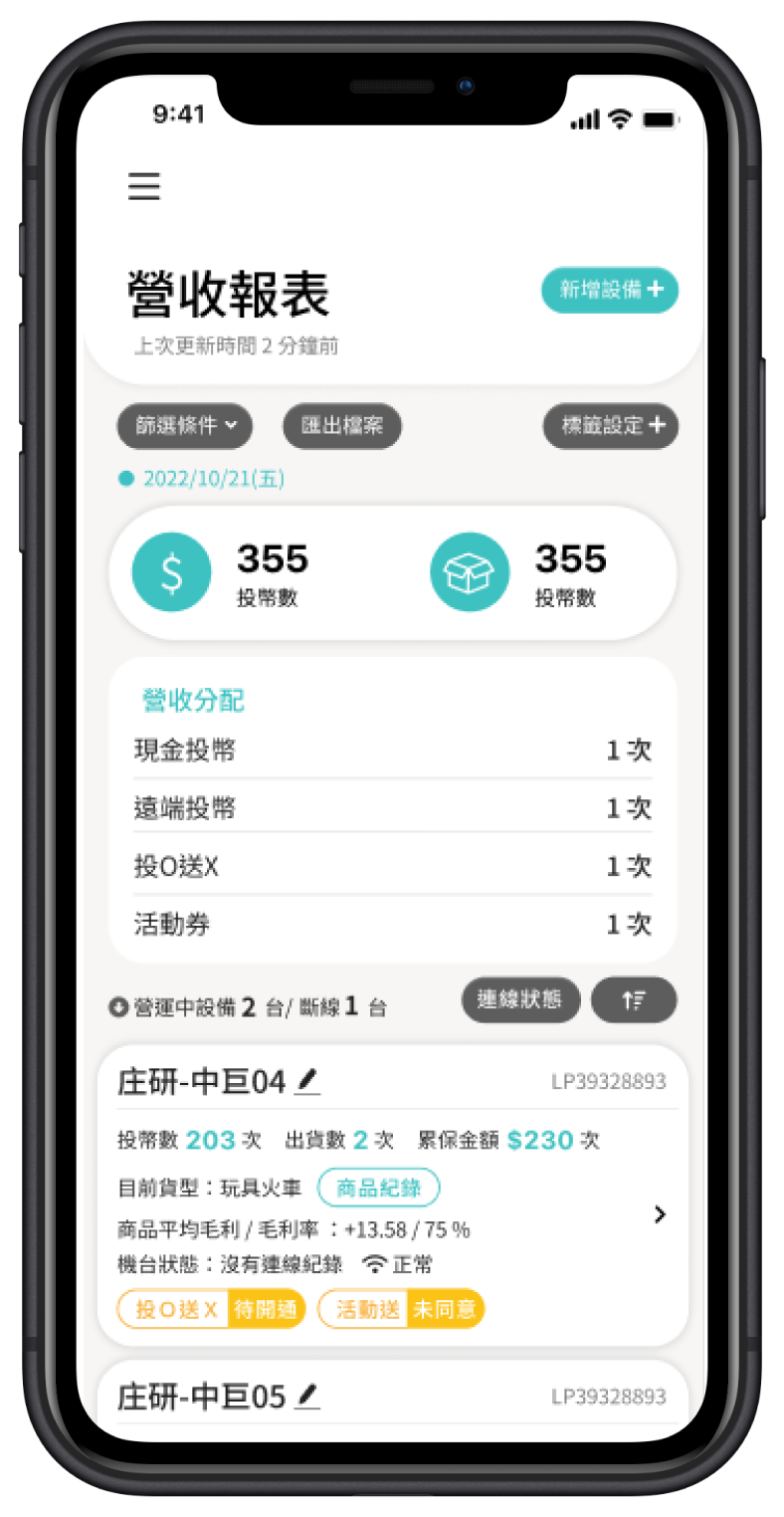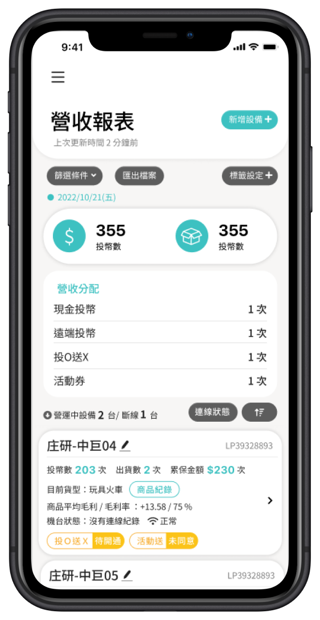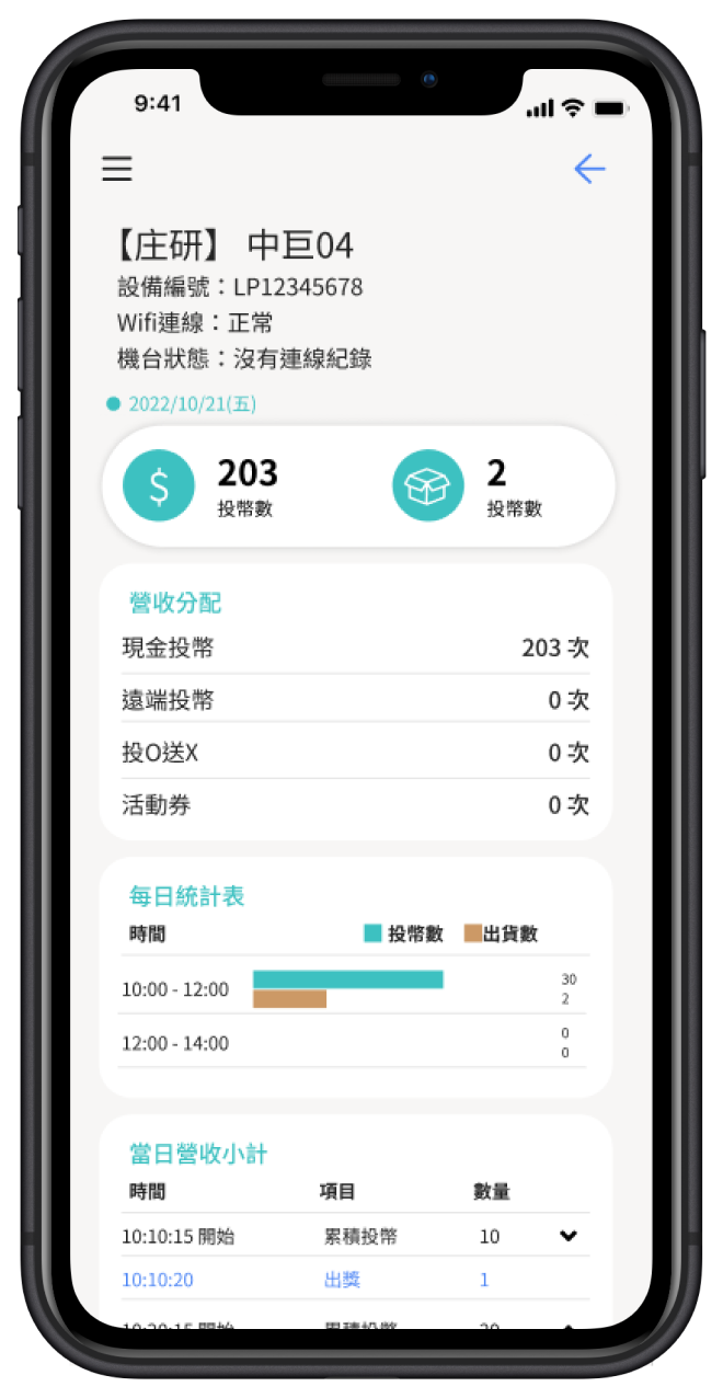 自訂時間區間,機台查看總營收 / 出貨,機台每日營收,客人消費頻率。